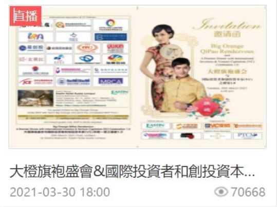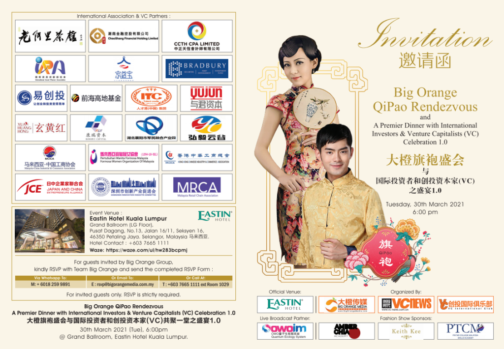 由大橙传媒集团(Big Orange Media Group)在中国的另外兩个品牌,即《VC News 商报》以及《VC创投俱乐部》,共同主办的大橙旗袍盛会〜与国际投资者和创投资本家(VC)之盛宴1.0(Big Orange Qipao Rendezvous ~ A Premier Dinner with International Investors & Venture Capitalists (VC) Celebration 1.0 )于2021年3月30日(星期二)在马来西亚首都吉隆坡盛大举行。
