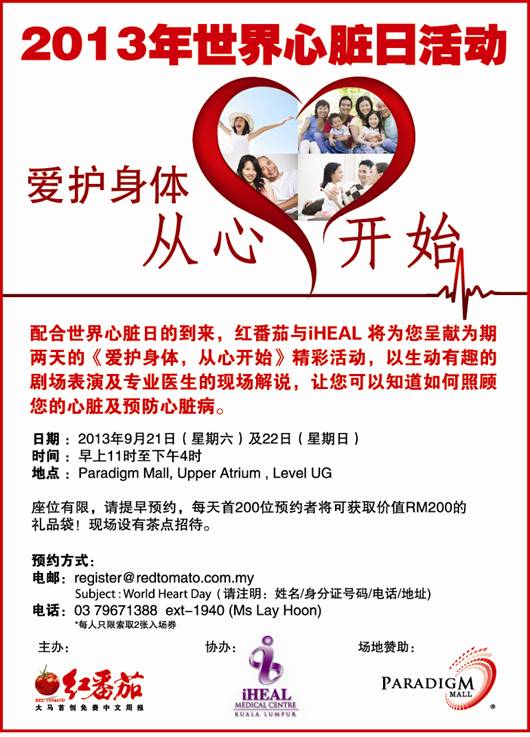 配合世界心脏日的到来,红番茄与iHEAL 将为您呈献为期两天的《爱护身体,从心开始》精彩活动,以生动有趣的剧场表演及专业医生的现场解说,让您可以知道如何照顾您的心脏及预防心脏病。
