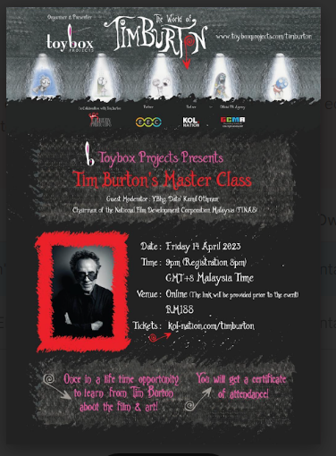 Fans, film enthusiasts, and visitors from all walks of life can enjoy this once-in-a-lifetime opportunity to learn from Tim Burton this 14 April 2023 (Friday) from 9.00 p.m. (GMT+8 Malaysia time) onwards, for only RM188 per person. Additionally, as a token of appreciation, those attending will receive an exclusive digital certificate after the masterclass.